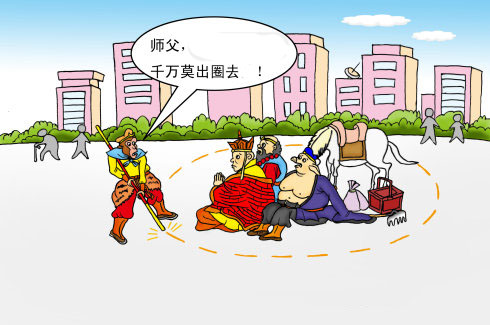 本期的太湖字谜说的是家喻户晓的“孙悟空三打白骨精”的故事。孙悟空保着唐僧去西天取经,途中经过一座大山,山中烟雾弥漫,孙悟空觉得有危险,就用金箍棒在地上划了一个圈让唐僧、猪八戒、沙僧站在圈子里,这样子如果有妖精接近,也无法进入圈子里。而孙悟空则去前路打探情况。
