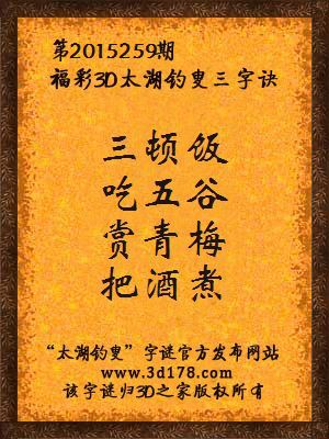 福彩3D第2015259期太湖字谜:三顿饭,吃五谷,赏青梅,把酒煮