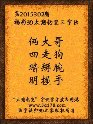 福彩3D第2015302期太湖字谜:俩大哥,四走狗,暗掰腕,明握手