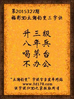 福彩3D第2015327期太湖字谜:升三级,八年兵,喝茅台,不办公