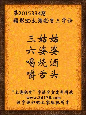 解福彩3D第2015334期太湖字谜:三姑姑,六婆婆,喝烧酒,嚼舌头