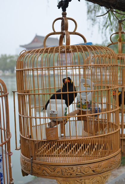 站八哥:既然是鸟笼,那根小横梁上站着一只鸟,这种鸟名叫八哥像鹦鹉一样会说话,明码解8