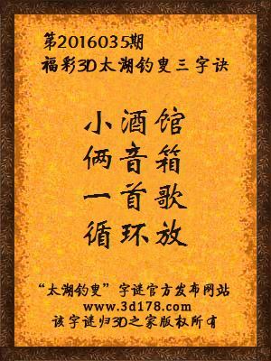 福彩3D第2016035期太湖字谜:小酒馆,俩音箱,一首歌,循环放