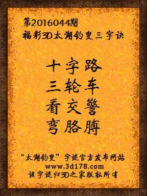 福彩3D第2016044期太湖字谜:十字路,三轮车,看交警,弯胳膊