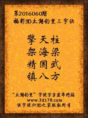 福彩3D第2016060期太湖字谜:擎天柱,架海梁,精国武,镇八方