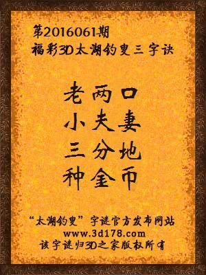 福彩3D第2016061期太湖字谜:老两口,小夫妻,三分地,种金币
