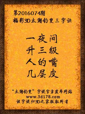 福彩3D第2016074期太湖字谜:一夜间,升三级,人的嘴,几层皮