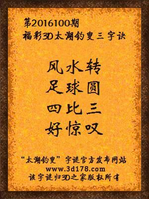 3d第2016100期太湖字谜:风水转,足球圆,四比三,好惊叹