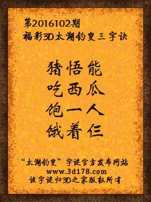 福彩第2016102期3d太湖字谜:猪悟能,吃西瓜,饱一人,饿着仨