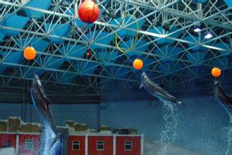 顶气球:海豚很有灵性,在饲养员的训练下会很多种杂技玩耍,俩个海豚同顶一个球,解0;