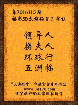 福彩第2016115期3d太湖字谜:领导人,携夫人,环球行,五洲临