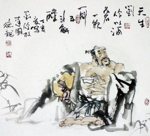 “盘山道,携酒壶”说得还是一个典故,也就是“竹林七贤”之一的酒仙刘伶的故事。刘伶常随身带一酒壶,乘着鹿车,边走边饮,一下人带掘挖工具随后,他叮嘱下人说:"我要是什么时候死了,你就地挖个坑把我埋了。"他总是喝得昏天黑地,兴头上还把衣服脱了,就光着身。有人来了,笑他不雅。他回答:“我以天地作房,以房为裤,你怎么跑到我的裤裆里来了?”