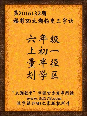 福彩第2016132期3d太湖字谜:六年级,上初一,量半径,划学区