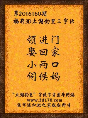 3d第2016160期太湖谜语:领进门,娶回家,小两口,伺候妈