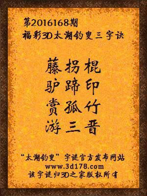 今日3d太湖字谜总汇,3d之家为您详细解答2016168期3d太湖字谜,并汇总多位专家精解太湖字谜供参考。