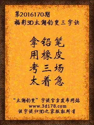 福彩第2016170期3d太湖字谜:拿铅笔,用橡皮,考三场,太着急