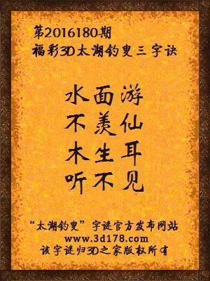 福彩第2016180期3d太湖字谜:水面游,不羡仙,木生耳,听不见