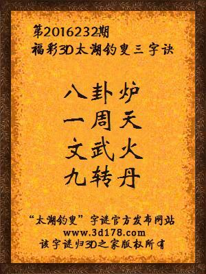 福彩第2016232期3d太湖字谜:八卦炉,一周天,文武火,九转丹