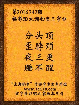 福彩第2016247期3d太湖字谜:分头顶,歪脖颈,夜三更,睡不醒