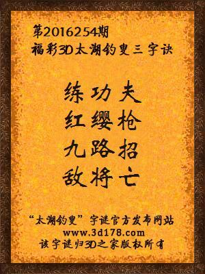 福彩第2016254期3d太湖字谜:练功夫,红缨枪,九路招,敌将亡