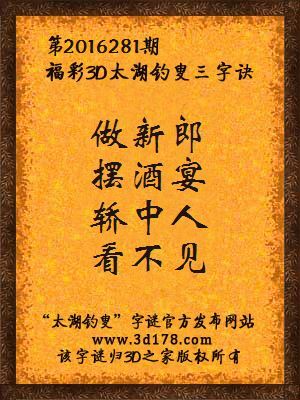 福彩第2016281期3d太湖字谜:王二姐,住独楼,思夫婿,泪珠流