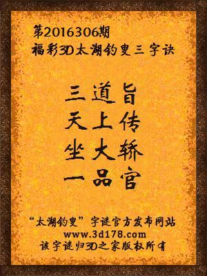 福彩第2016306期3d太湖字谜:三道旨,天上传,坐大轿,一品官