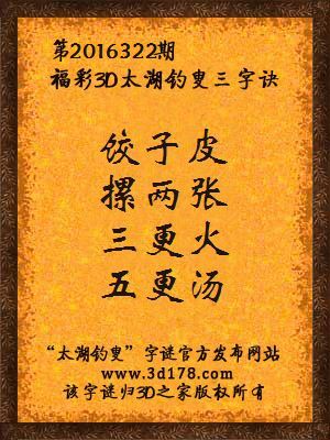 福彩第2016322期3d太湖字谜:饺子皮,摞两张,三更火,五更汤