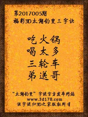 福彩第2017005期3d太湖字谜:吃火锅,喝太多,三轮车,弟送哥