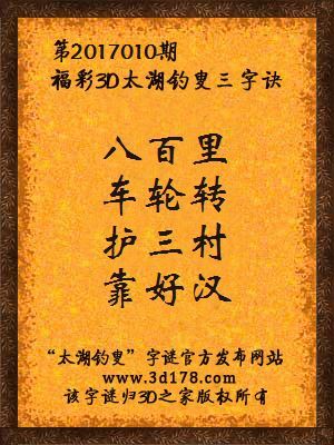 福彩第2017010期3d太湖字谜:八百里,车轮转,护三村,靠好汉