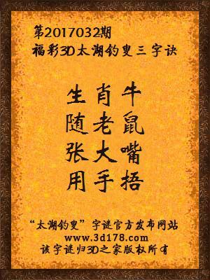福彩第2017032期3d太湖字谜:生肖牛,随老鼠,张大嘴,用手捂