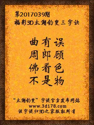 福彩第2017039期3d太湖字谜:曲有误,周郎顾,佛看色,不是物