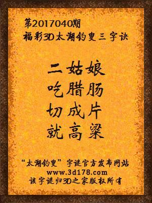 福彩第2017040期3d太湖字谜:二姑娘,吃腊肠,切成片,就高粱
