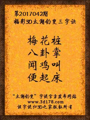 福彩第2017042期3d太湖字谜:梅花桩,八卦掌,闻鸡叫,便起床
