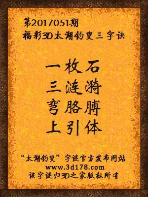 福彩第2017051期3d太湖字谜:一枚石,三涟漪,弯胳膊,上引体