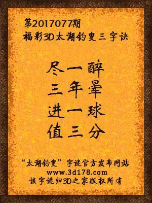 福彩第2017077期3d太湖字谜:尽一醉,三年晕,进一球,值三分