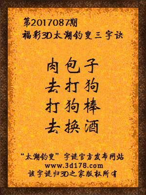福彩第2017087期3d太湖字谜:肉包子,去打狗,打狗棒,去换酒