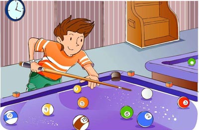 打台球---台球桌上摆着各种颜色的台球,形圆0;