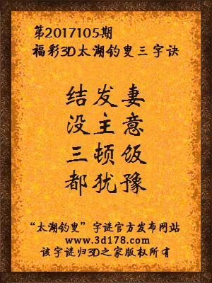 福彩第2017105期3d太湖字谜:结发妻,没主意,三顿饭,都犹豫