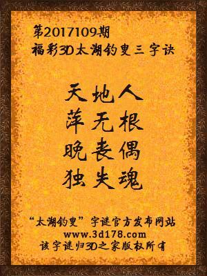 福彩第2017109期3d太湖字谜:天地人,萍无根,晚丧偶,独失魂