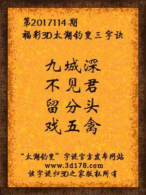 福彩第2017114期3d太湖字谜:九城深,不见君,留分头,戏五禽