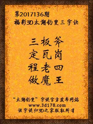福彩第2017136期3d太湖字谜:三板斧,定瓦岗,程老四,做魔王