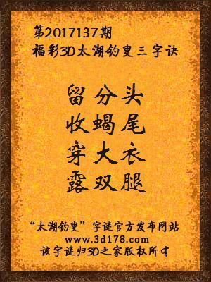 福彩第2017137期3d太湖字谜:留分头,收蝎尾,穿大衣,露双腿