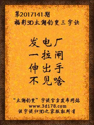 福彩第2017141期3d太湖字谜:发电厂,一拉闸,伸出手,不见啥