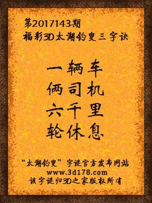 福彩第2017143期3d太湖字谜:一辆车,俩司机,六千里,轮休息