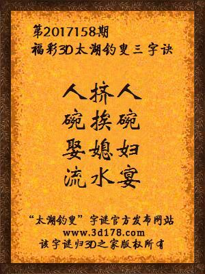 福彩第2017158期3d太湖字谜:人挤人,碗挨碗,娶媳妇,流水宴