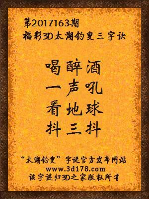 福彩第2017163期3d太湖字谜:喝醉酒,一声吼,看地球,抖三抖