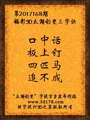 福彩第2017168期3d太湖字谜:口中话,板上钉,四匹马,追不成