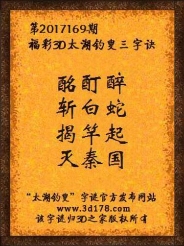 福彩第2017169期3d太湖字谜:酩酊醉,斩白蛇,揭竿起,灭秦国