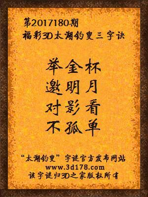 今日3d太湖字谜总汇,3d之家为您详细解答2017180期3d太湖字谜,并汇总多位专家精解太湖字谜供参考。