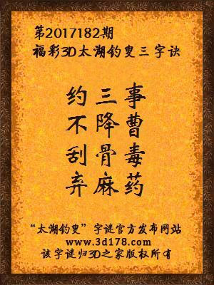 福彩第2017182期3d太湖字谜:约三事,不降曹,刮骨毒,弃麻药